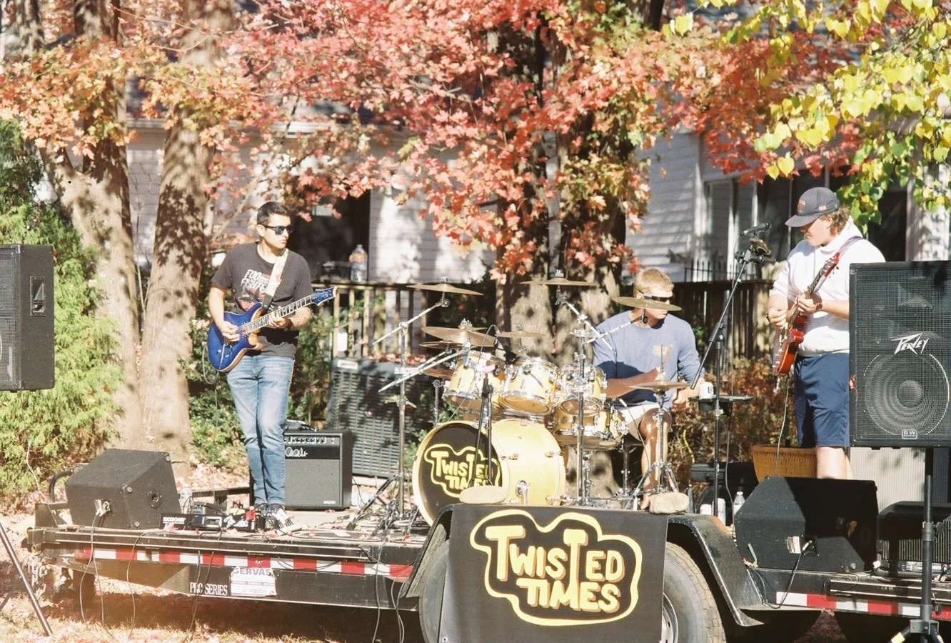 A band performing in a room with electric guitars, bass, and drums. The drummer's kit has a "Twisted Times" logo. Colored lighting creates a vibrant atmosphere. Amplifiers and musical gear are visible.